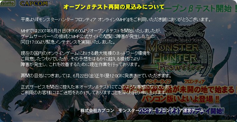 MHFでは2007年6月21日(木)16:00より、オープンβテストを開始いたしましたが、ゲームサーバーへの接続とMHF公式サイトの閲覧に障害が発生したため、同日17:00より緊急メンテナンスを実施いたしました。